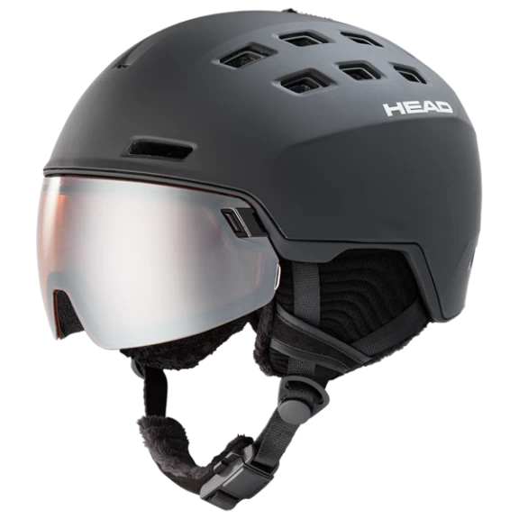 La construcción de la visera de HEAD es una capa con protección UV y frente al viento que permite a los esquiadores llevar gafas graduadas. Al igual que en los cascos de moto, la visera puede bajarse para proteger los ojos.
