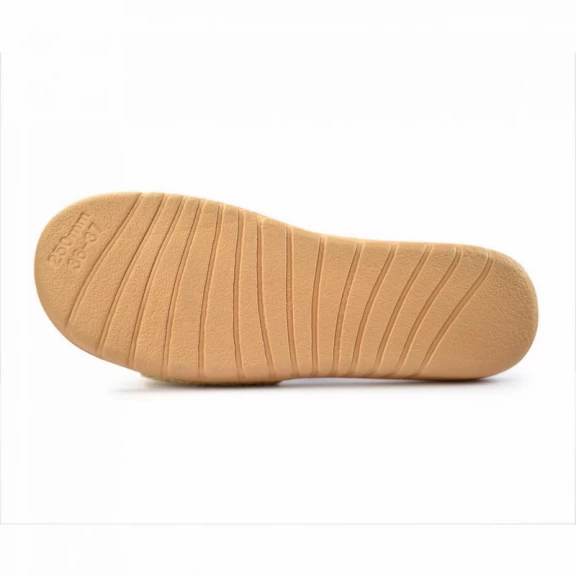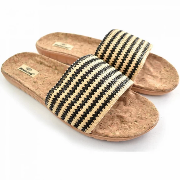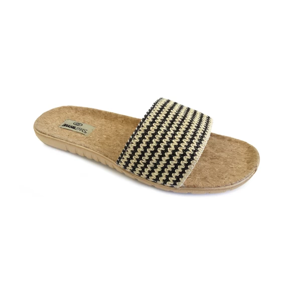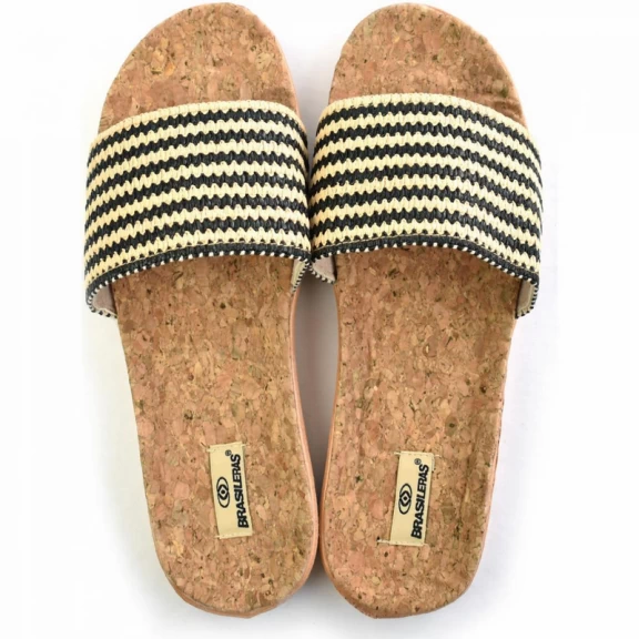 Chanclas de estilo informal para mujer. Muy ligeras y de estilo rústico. La base es de suave corcho y la suela está elaborada con goma EVA. Tira central en cenefa zigzag en negro y beige.