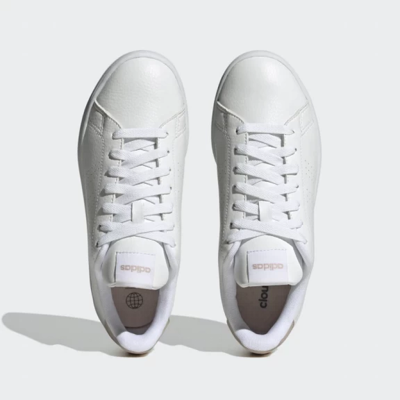 Zapatillas adidas Advantage de mujer, de horma clásica e inspirada en el mundo del tenis. Parte superior de piel sintética en color blanco y detalles marrones, forro textil y cierre de cordones. Plantilla Cloudfoam muy confortable, suela de goma resistente.