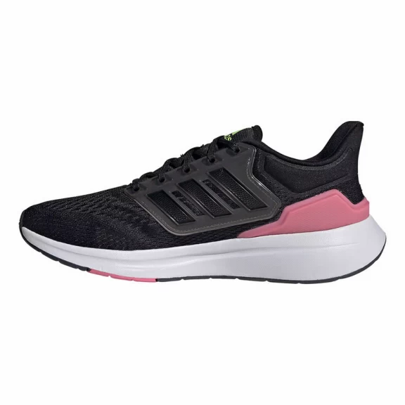 Zapatillas adidas EQ21 Run en negro gris rosa de mujer, parte superior transpirable mantiene los pies frescos en las carreras de larga distancia.
