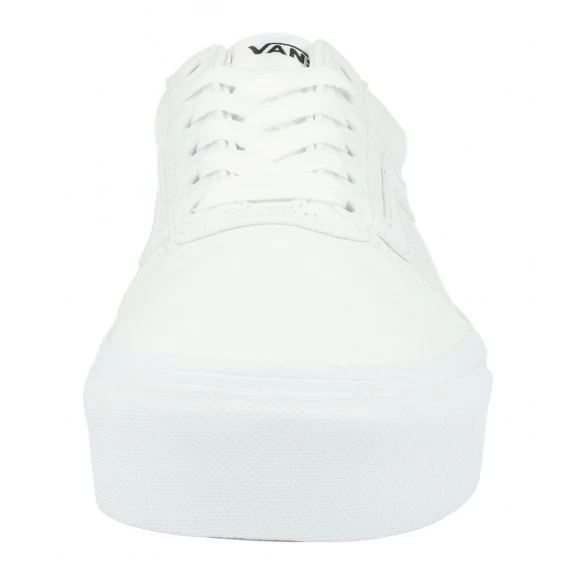 Zapatillas de mujer de la marca Vans en color blanco con suela de plataforma, logotipo lateral de Vans, puntera reforzada para resistir el desgaste, la zona del tobillo está acolchada perfectamente para una sujeción y flexibilidad óptimas, suela de caucho con plataforma para un agarre firme, ideales para lucir con tus looks más urbanos.