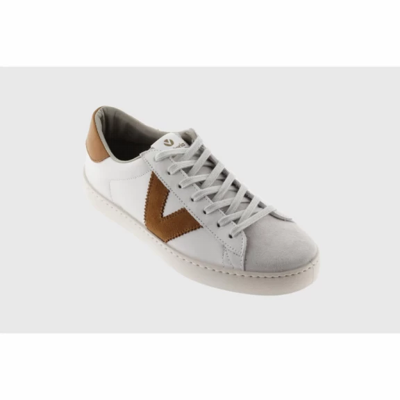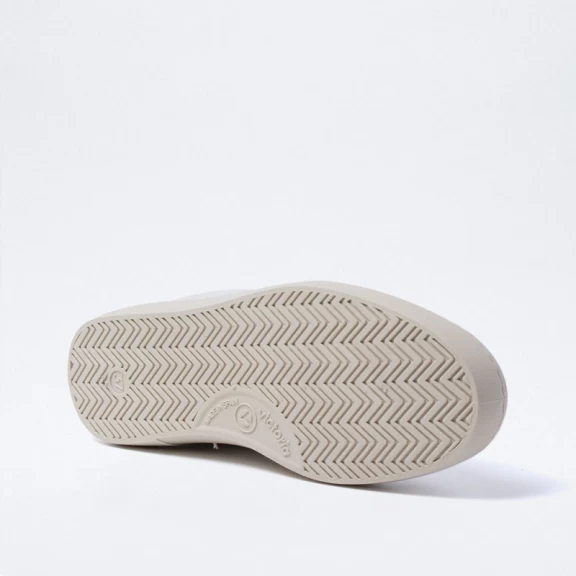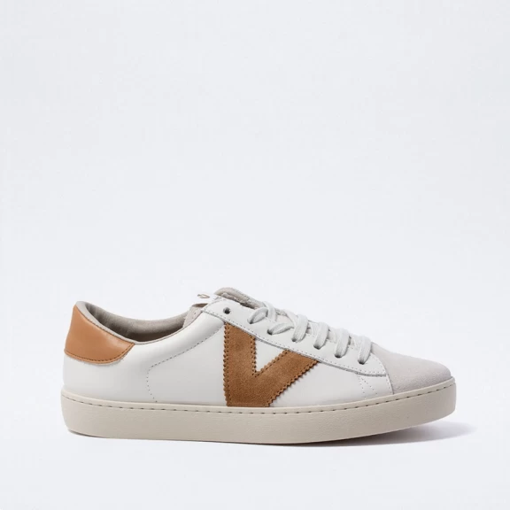 Las zapatillas Victoria 1126142 están elaboradas en cuero 100% de color beige con la puntera de serraje y los detalles marones en la V de Victoria y el talón que le dan un toque de color.